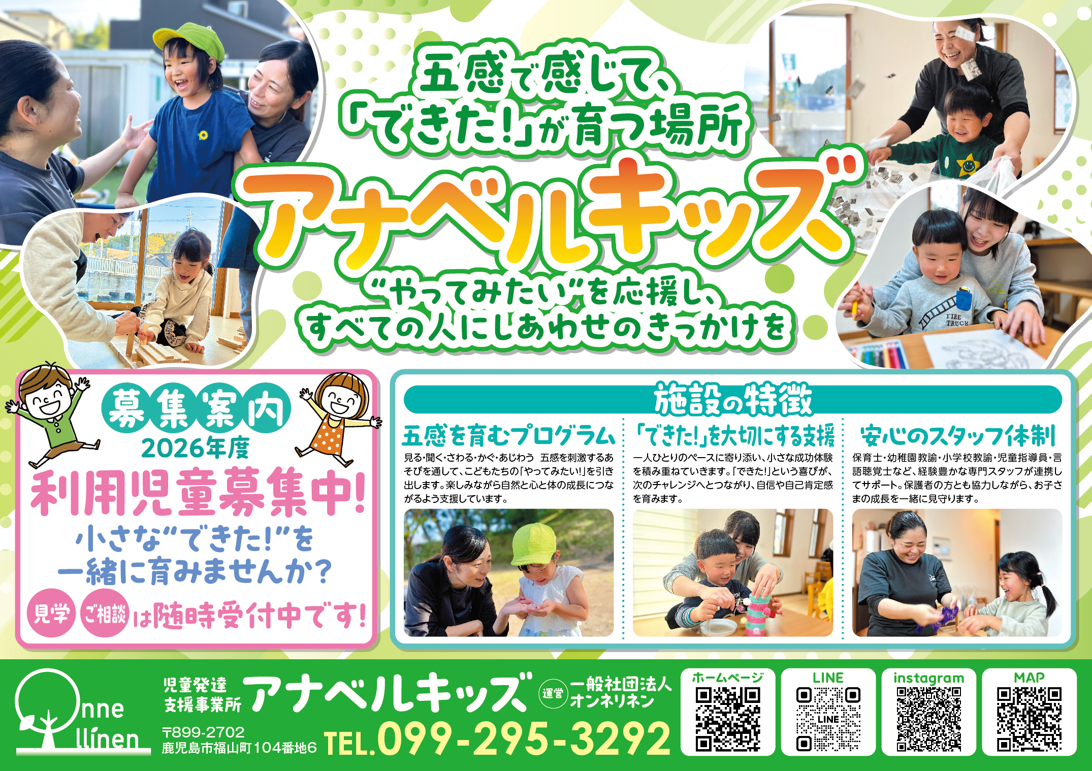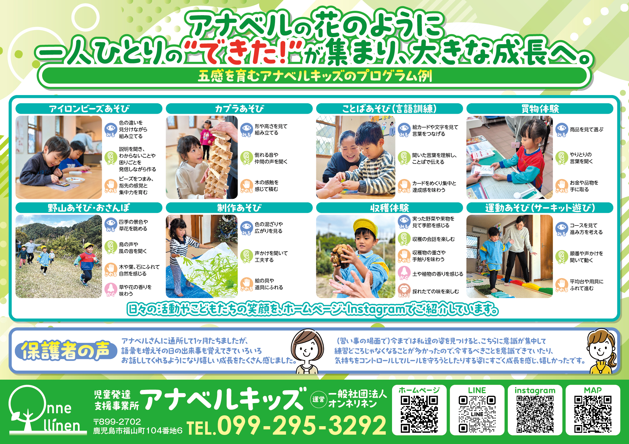 今回のチラシは、これまでのご好評いただいた内容をベースに、冬らしい落ち着いたデザインにリニューアルしました 🏠 活動写真も最新のものに差し替え、こどもたちの生き生きとした表情や、アナベルキッズが大切にしている「冬の温もり」を感じていただける一枚になっています🌷