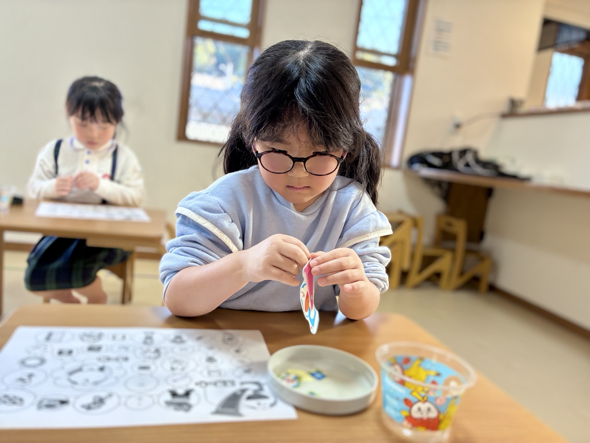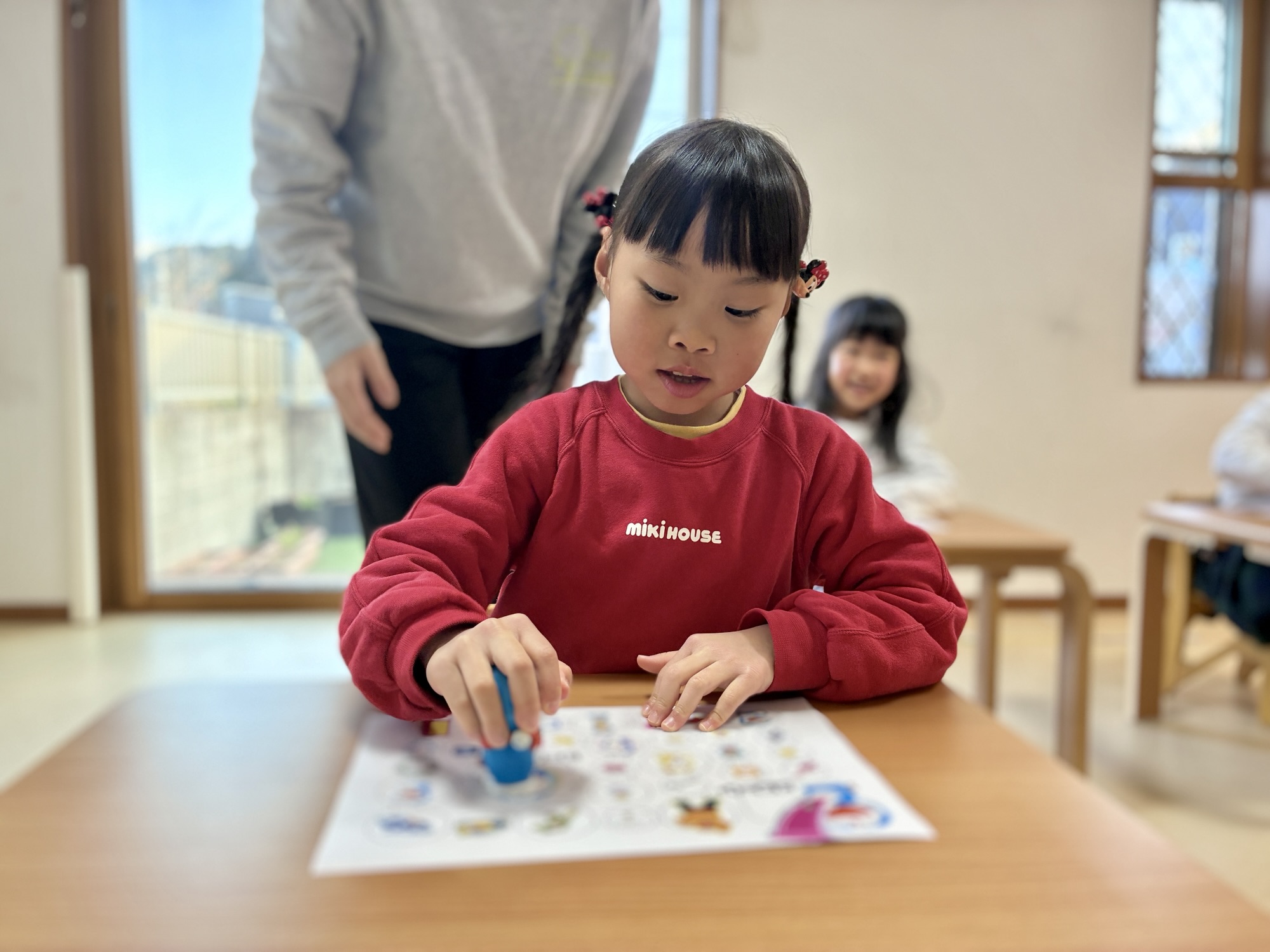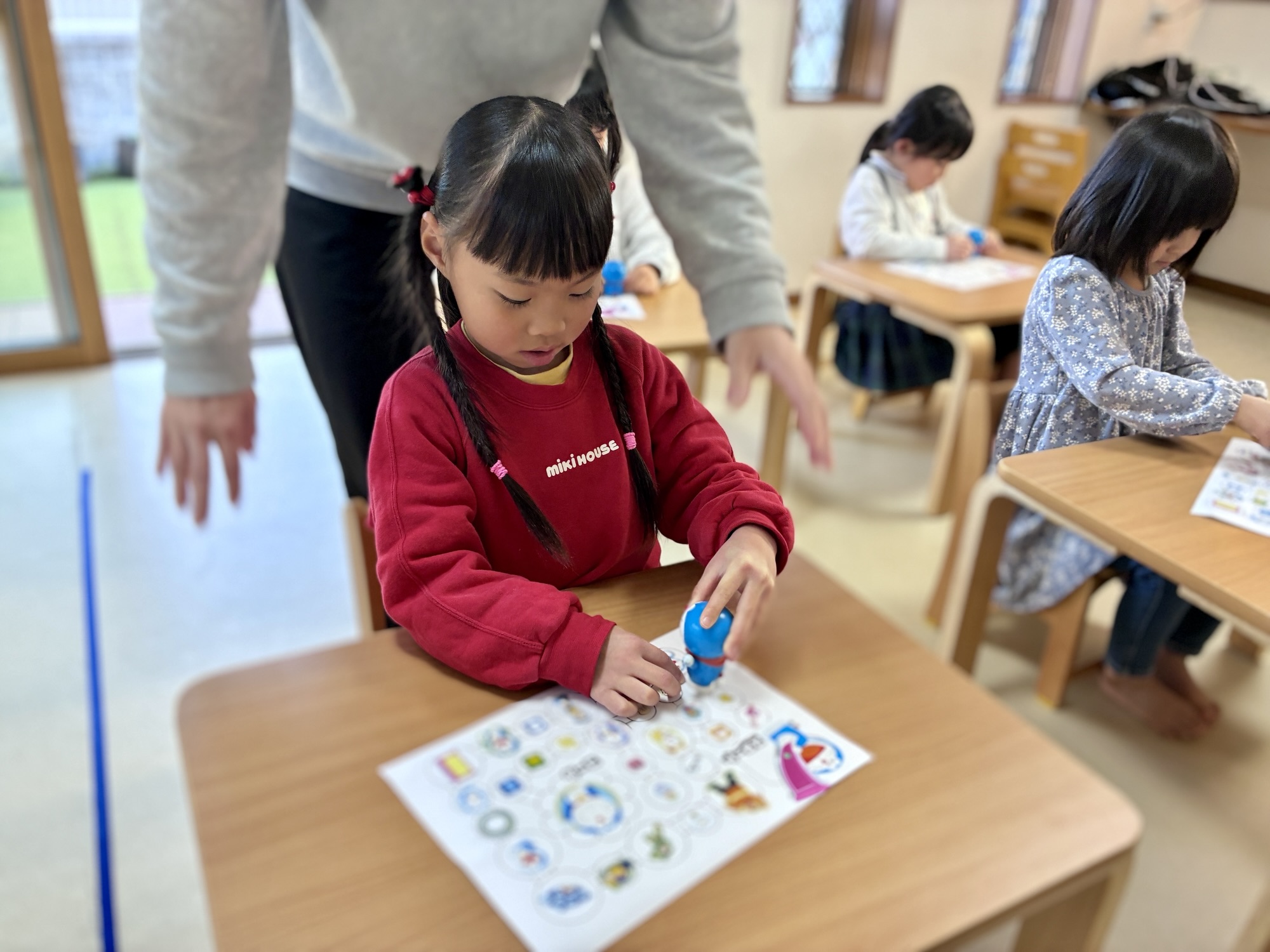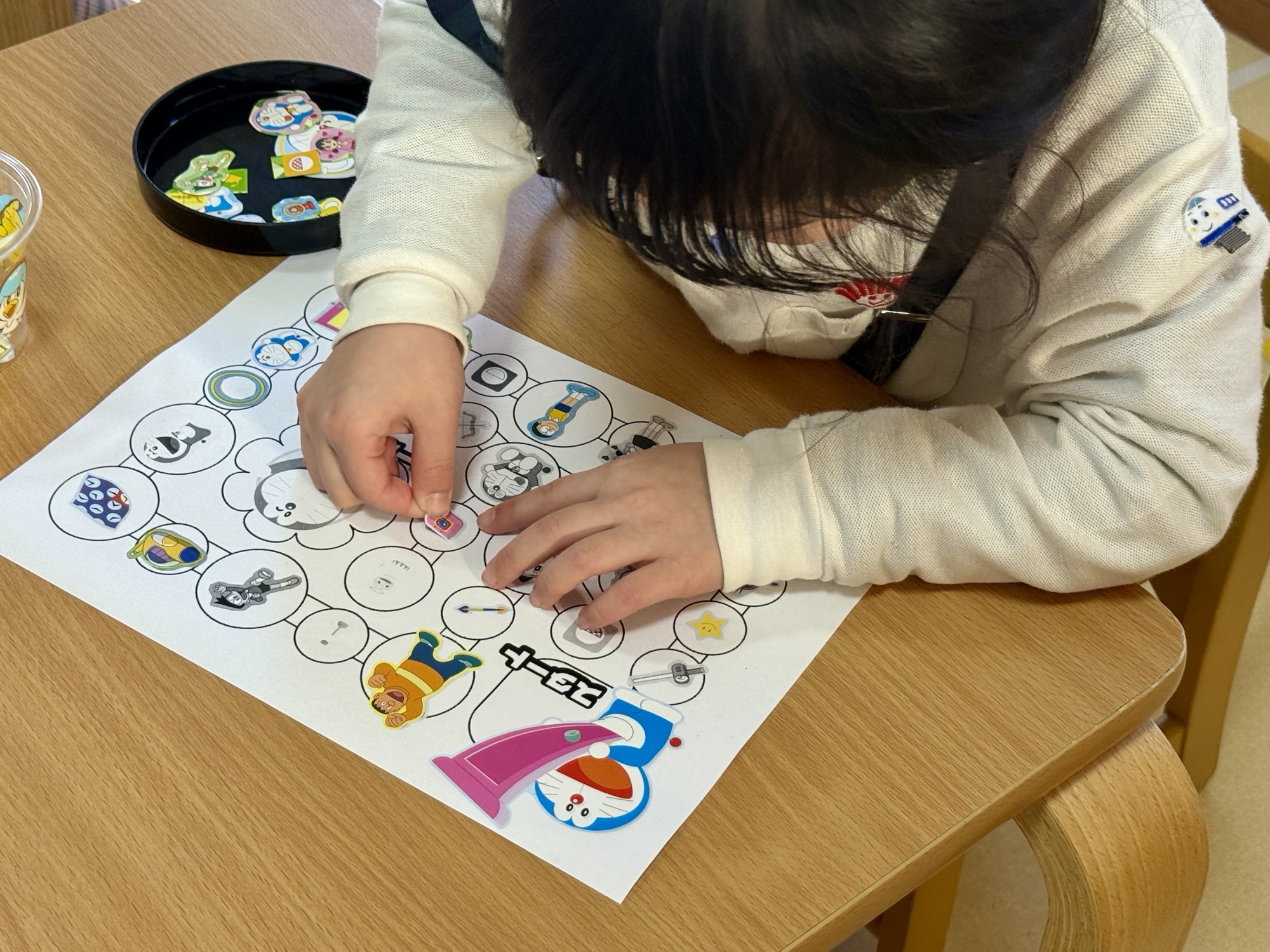 まずは、すごろくの台紙にシールを貼って、コースを完成させるところからスタートしました。 同じ絵柄を探して貼る「マッチング」の作業です。 ずれないように気を付けながら慎重に指先を動かす子、大好きな道具の絵柄に顔を輝かせる子。「どこに貼るのかな?」と迷ったときも、スタッフと一緒に確認することで、最後にはみんな正しく完成させることができました。 自分で作り上げた自分だけのすごろくに、お友達の表情は達成感で溢れていました。