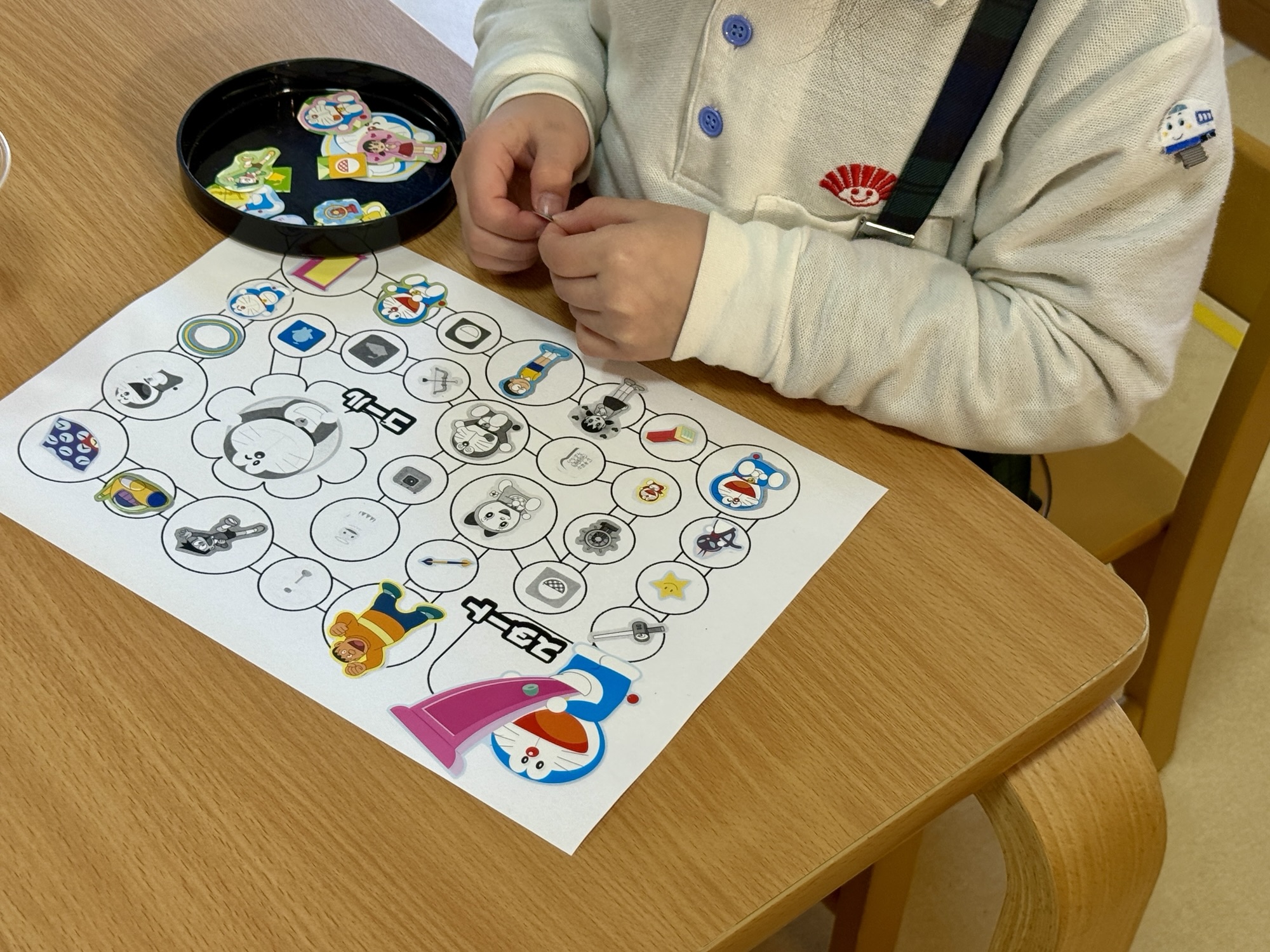 まずは、すごろくの台紙にシールを貼って、コースを完成させるところからスタートしました。 同じ絵柄を探して貼る「マッチング」の作業です。 ずれないように気を付けながら慎重に指先を動かす子、大好きな道具の絵柄に顔を輝かせる子。「どこに貼るのかな?」と迷ったときも、スタッフと一緒に確認することで、最後にはみんな正しく完成させることができました。 自分で作り上げた自分だけのすごろくに、お友達の表情は達成感で溢れていました。
