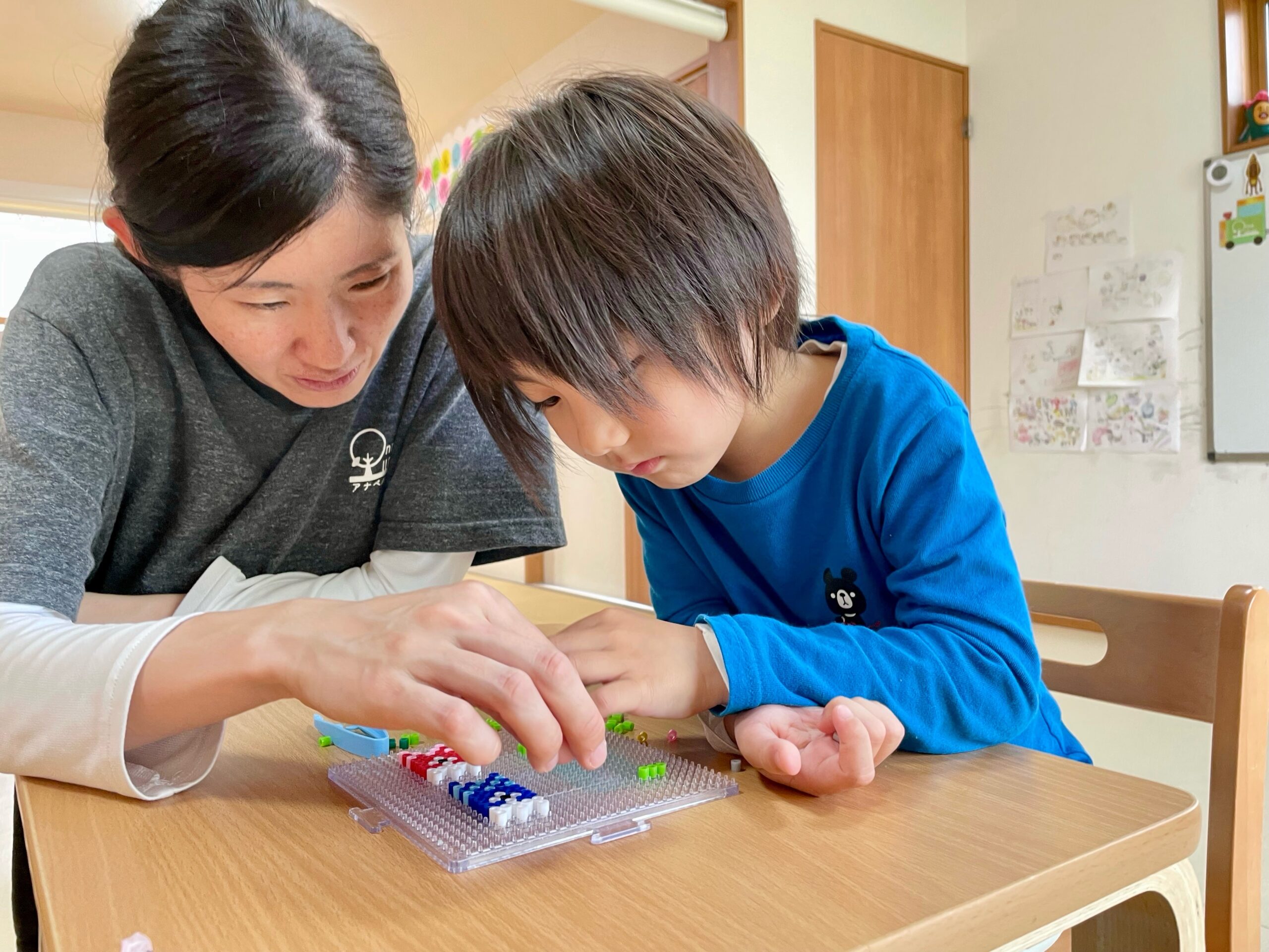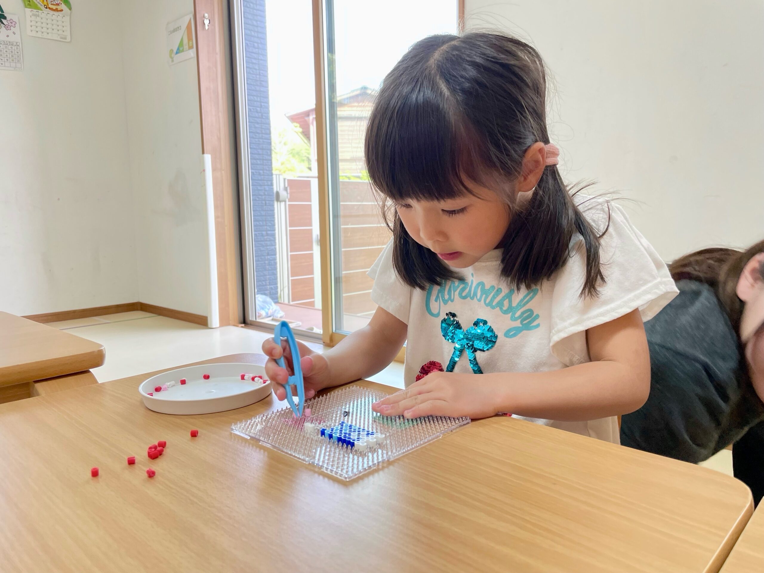 ピンセットを握る手に力が入りすぎてビーズが震えてしまう場面もありましたが、「軽く持ってみようか」と声をかけると、少しずつ力加減を意識する様子が見られました。