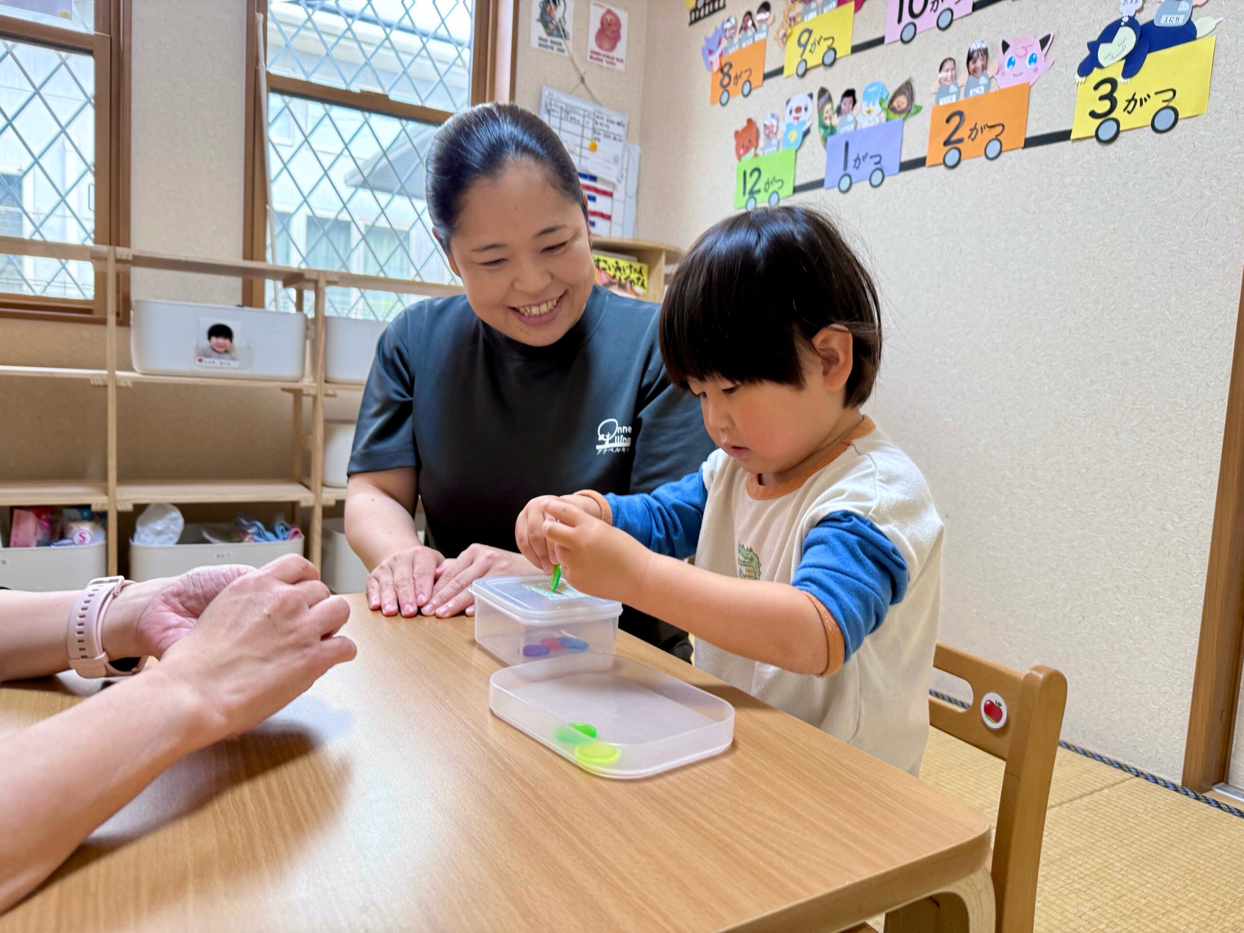 プットイン(入れるあそび)では、おはじきを色ごとに分けて入れる中で、手先の操作や色・数への意識、集中して取り組む姿が印象的でした。