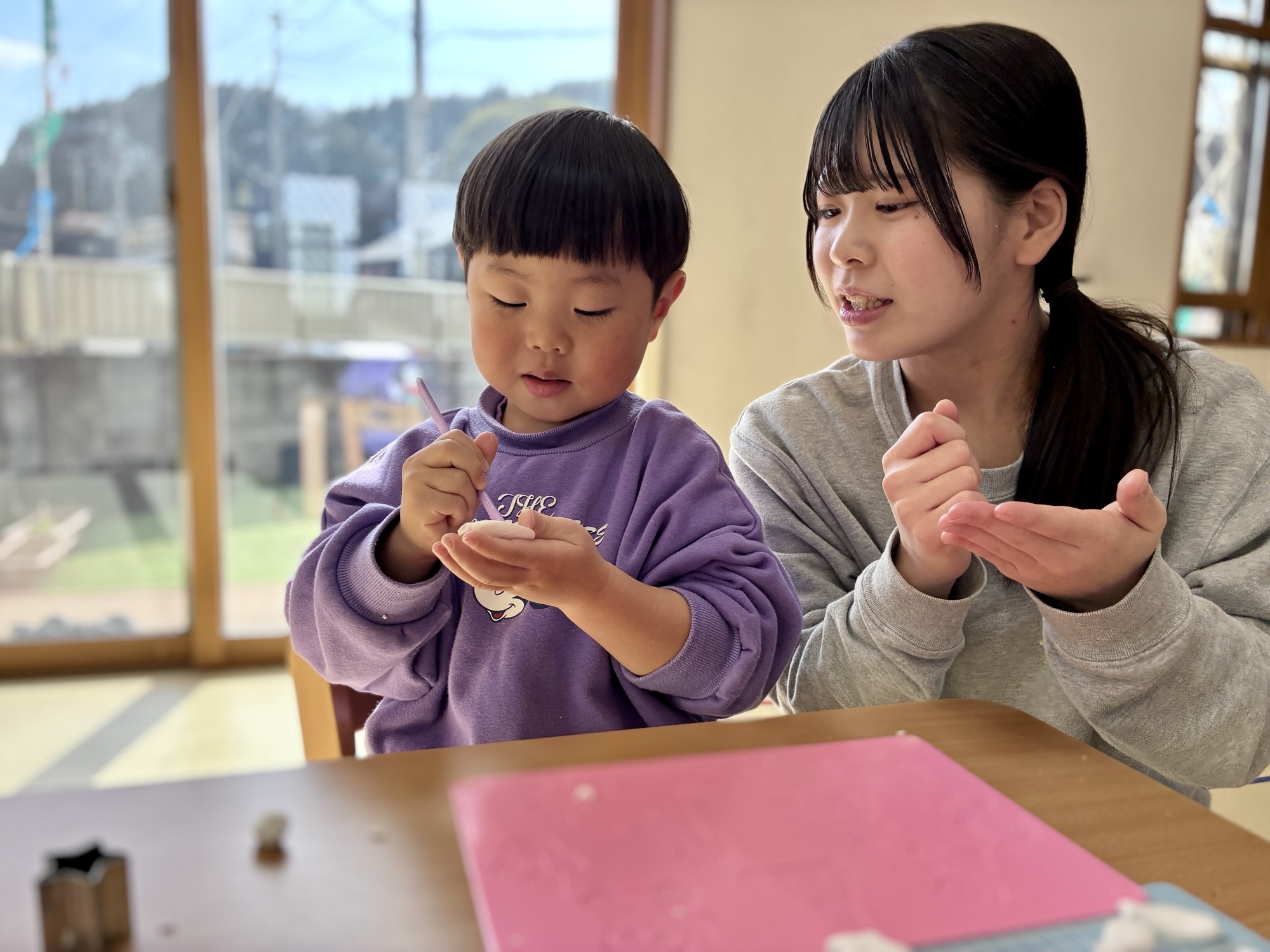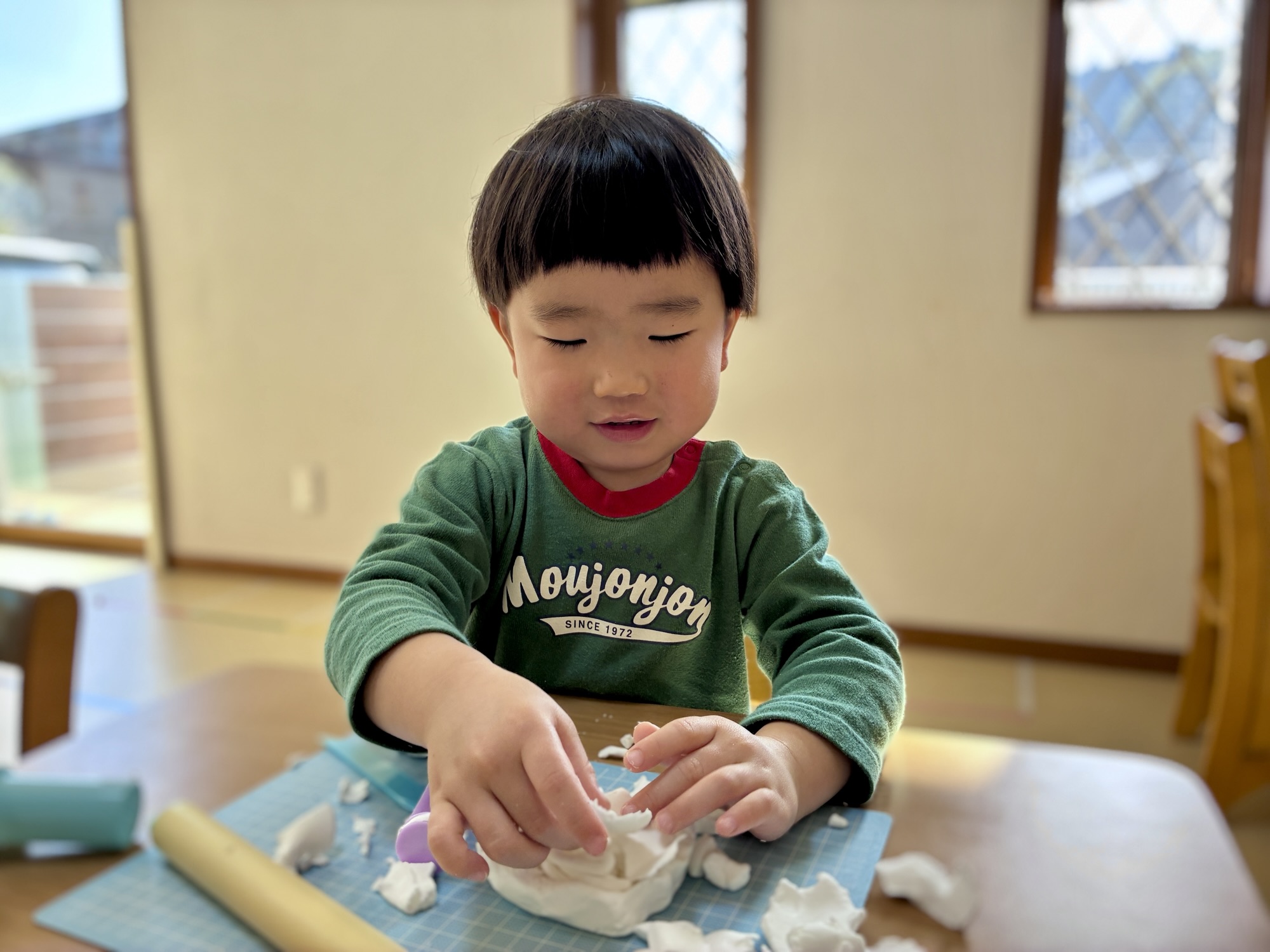 柔らかな冬の光が差し込むお部屋で、この日は「粘土遊び」を楽しみました。