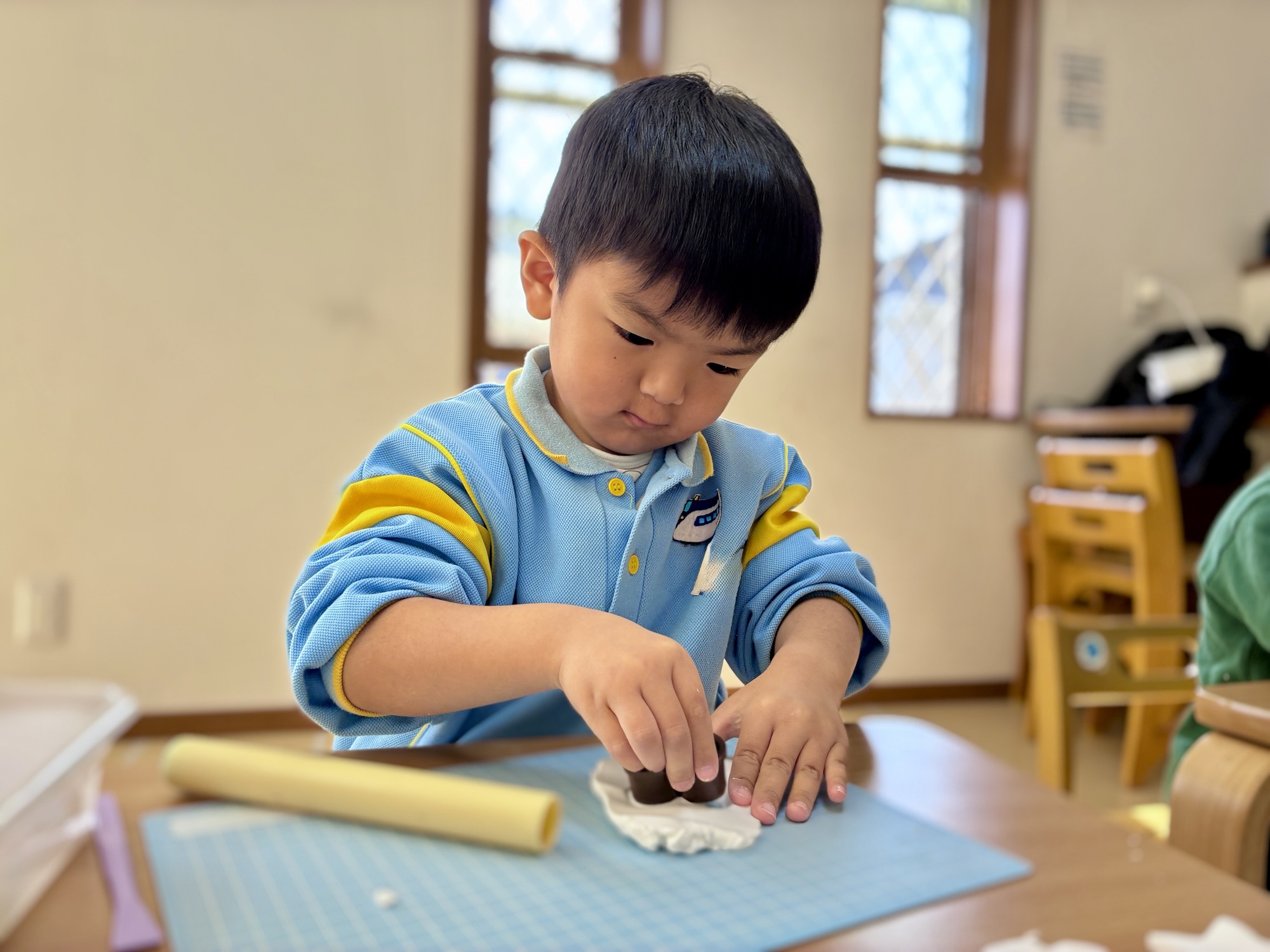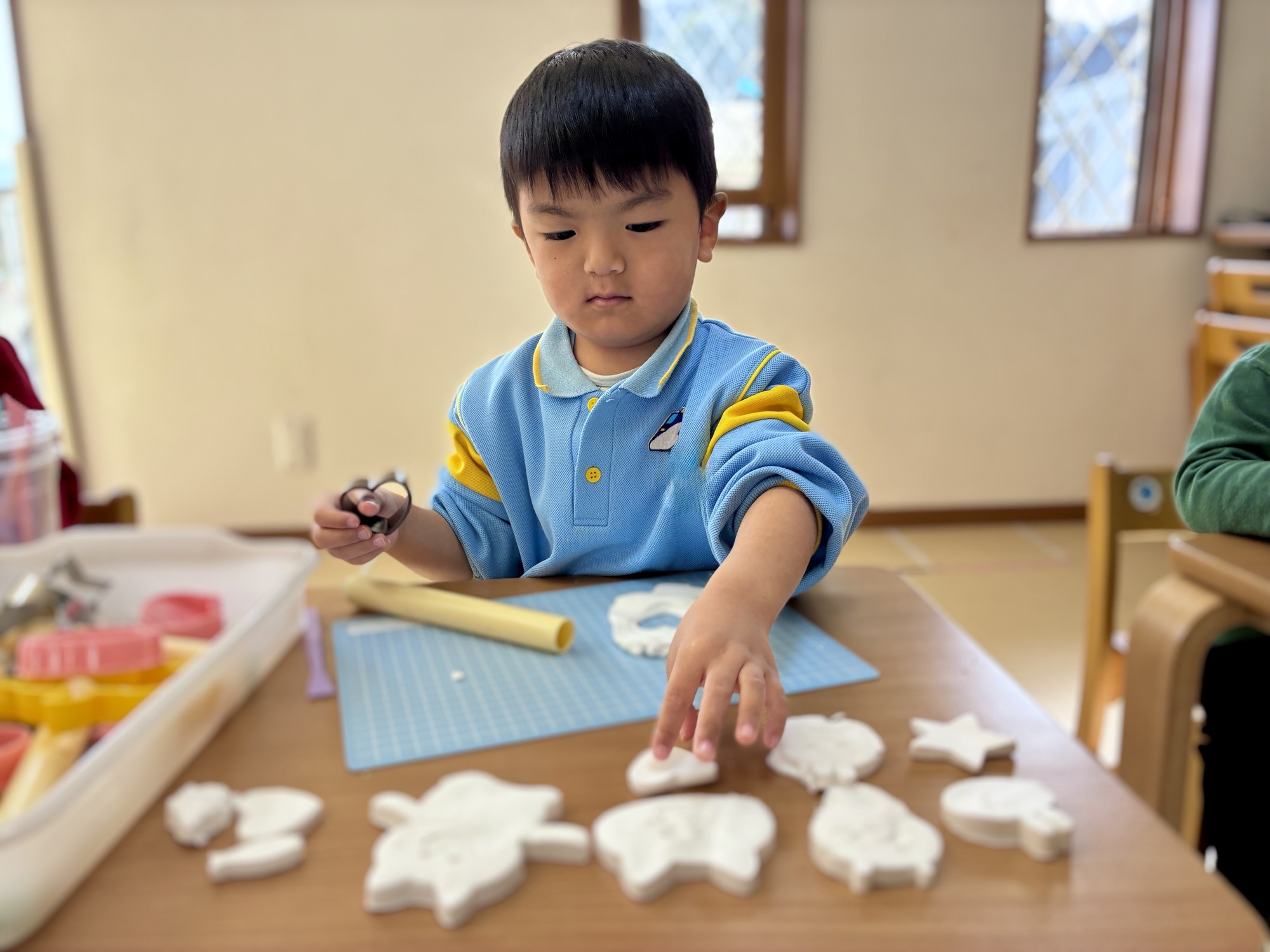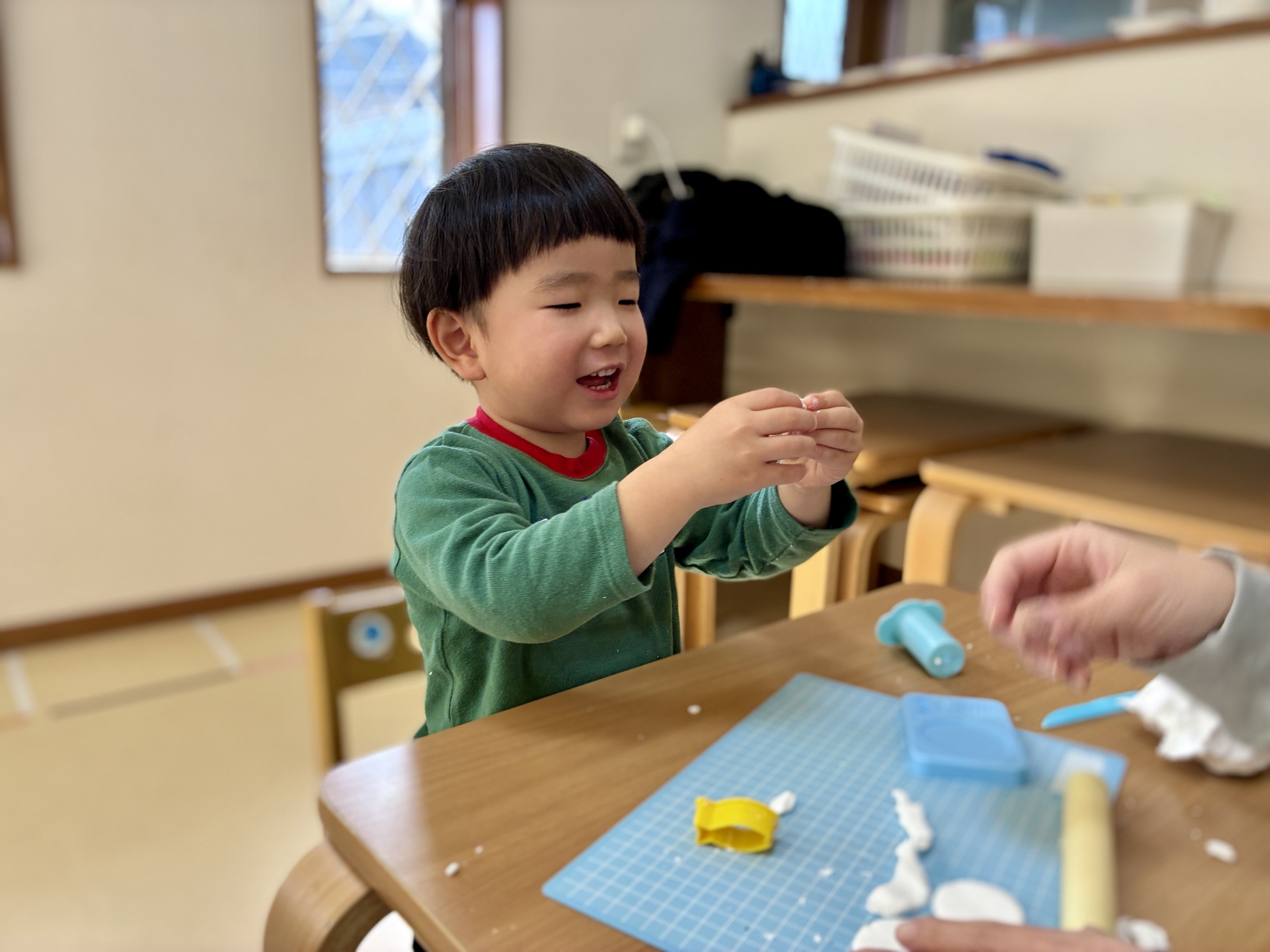 粘土が柔らかくなると、次は思い思いの形作りが始まります。 型抜きを使って「さかな!」「うさぎさん!」と嬉しそうに教えてくれるお友達。自分の好きな形をじっくりと選び、丁寧に型を抜く瞬間の真剣な眼差しは、小さなアーティストそのものでした。