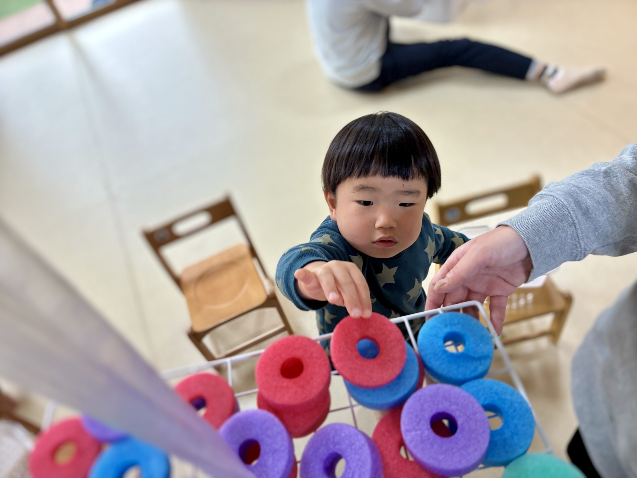 お友達が挑戦しているときには「どこに置くのかな?」「頑張れ!」と一緒に注目し、応援する姿も見られました 。