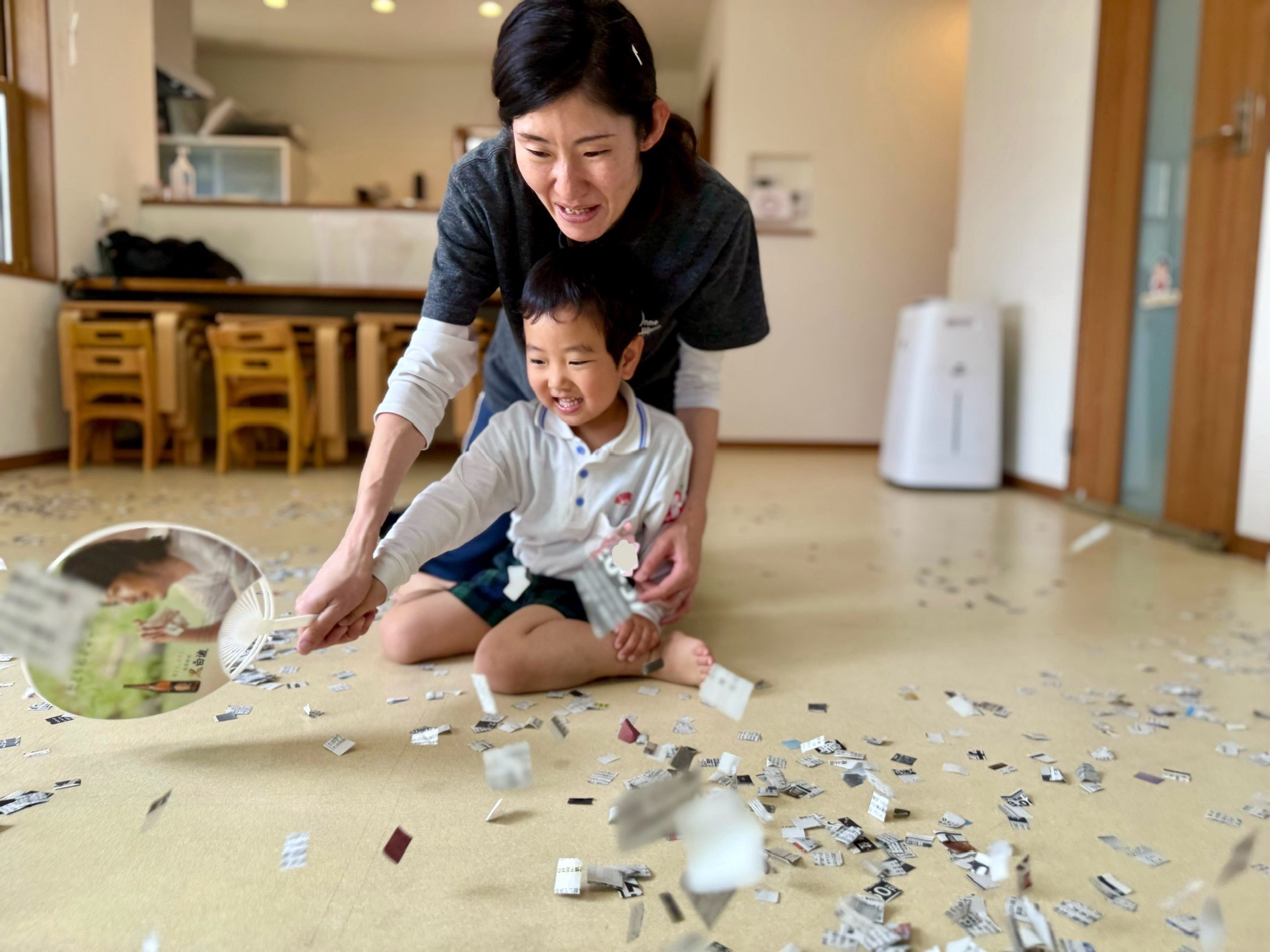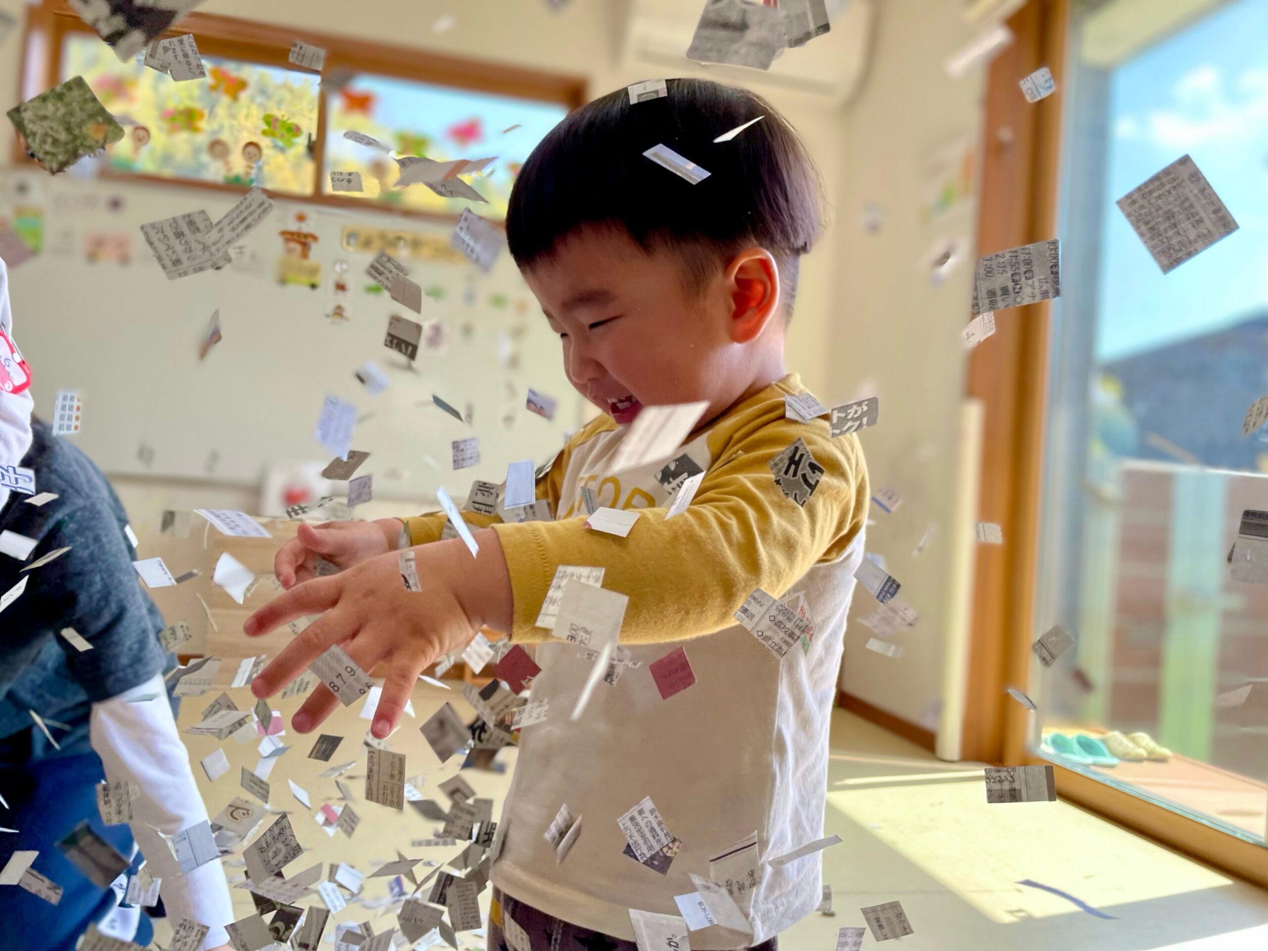 紙吹雪あそびは、ただ楽しいだけではなく、五感を使い、動きを工夫し、人と関わりながら進んでいく、こどもたちにとっての“育ちの宝箱”のような時間。