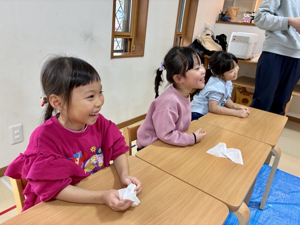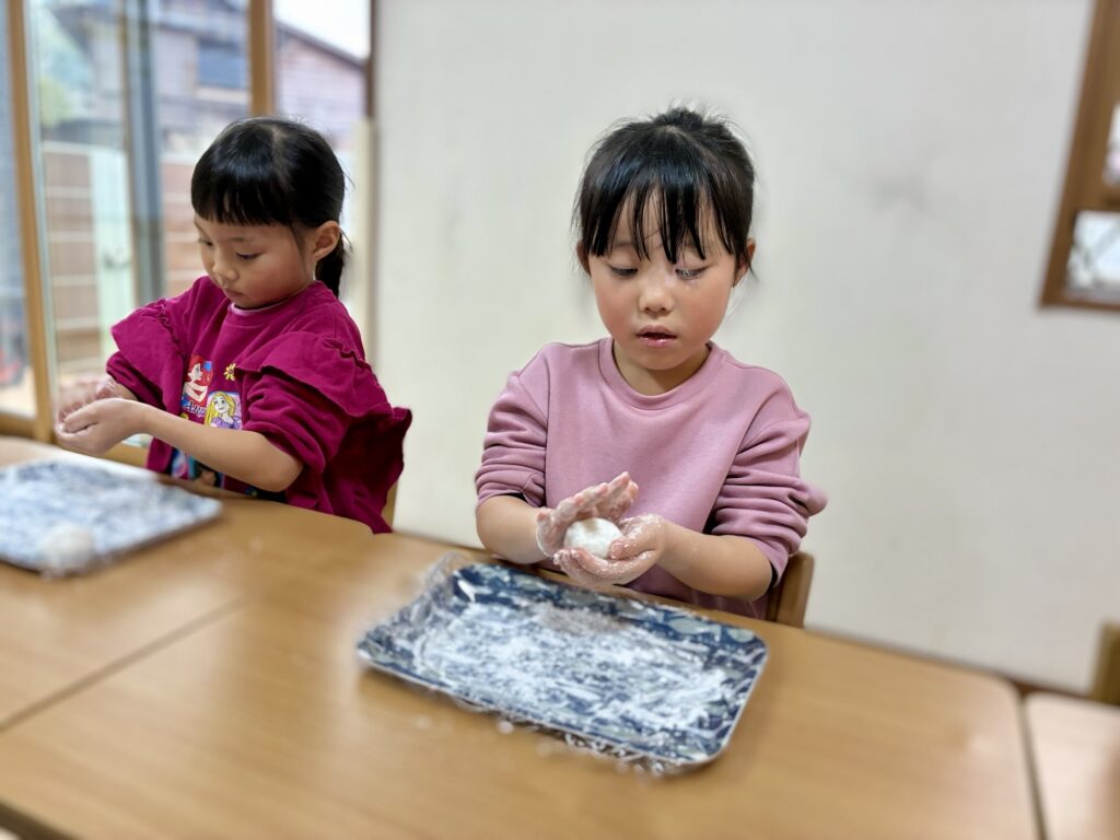 餅きり器からころんと出てくるお餅を、自分の手で丸める時の真剣な表情。自分の手で直接触れて、丁寧にかたちを 変えていく。そこには、新しい一年を自分の力で歩み出そうとする、こどもたちの静かな決意が宿っているようでした。お部屋全体が、お餅の温もりと「自分でできた」という小さな自信に包まれた、穏やかな新年のひとときとなりました。