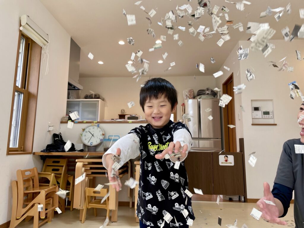 この日は新聞紙を使って紙吹雪あそびをしました。みんなで「3・2・1!」の合図で空へ――ひらひらと舞い上がる紙に、こどもたちは目を輝かせていました。 ひとりで高く投げてみたり、友達と同時に「せーの!」で舞わせたり。風に乗ってゆらゆらと落ちてくる...