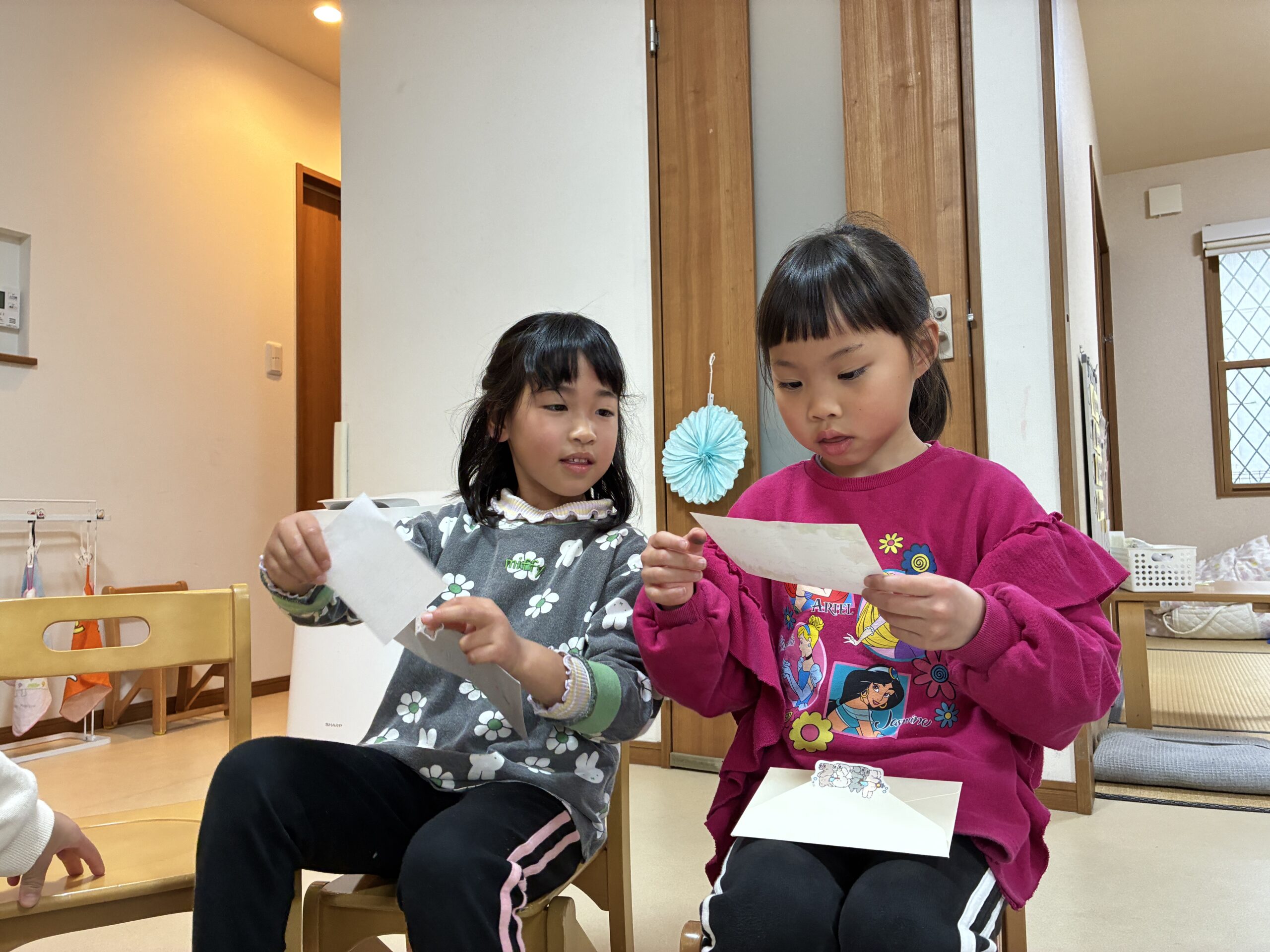「読んでもいい?」と尋ねると、恥ずかしくて顔を隠してしまう姿もありましたが、その温かな内容に、受け取ったお友達もスタッフも、みんなの心がジーンと熱くなりました。