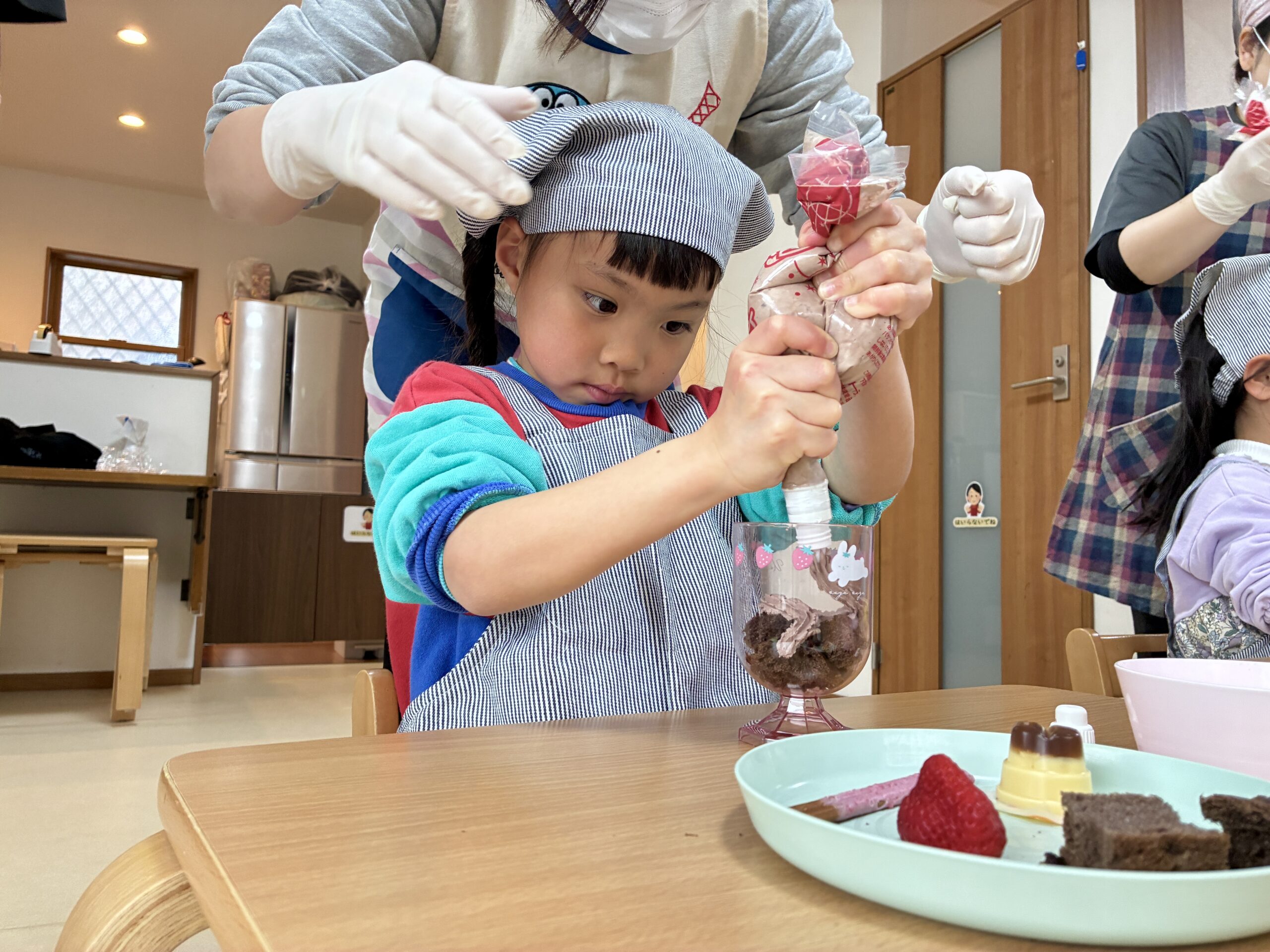 切り終えたいちごをグラスの中へ、大切に並べていくその姿には、自分だけの作品を作り上げる喜びが溢れていました。 2種類のクリームを前にして「どっちにしようかな?」と迷い、うまく言葉にできず焦ってしまう場面もありました。
